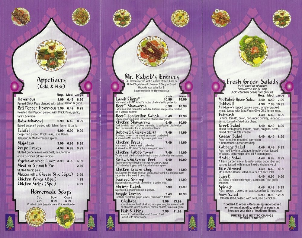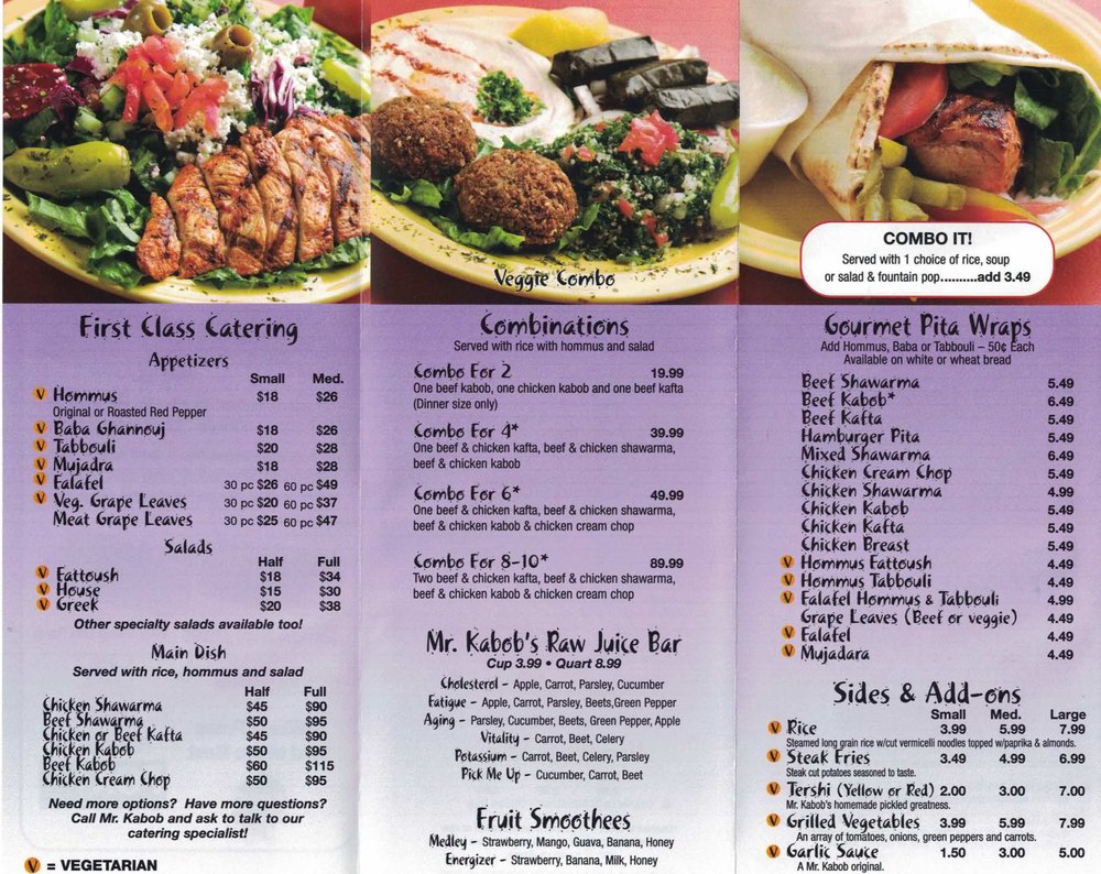 Extra lean beef marinated with Mr. Kabobs recipe slow roasted on a vertical skewer. Cooked to order Consuming undercooked or raw meat, poultry, seafood or eggs may increase your risk of foodborne illness.